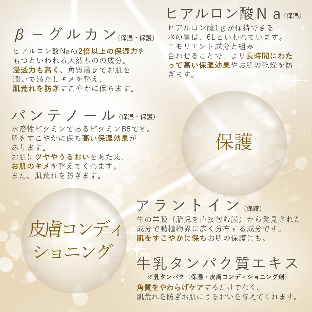 【成分】水、シア脂、ツバキ種子油、PG、グリセリン、ベタイン、ヤギ乳エキス、ポリメタクリル酸グリセリル、(メチルビニルエーテル/マレイン酸)コポリマー、β−グルカン、パンテノール、トコフェロール、ポリアクリルアミド、(C13,14)イソパラフィン、ラウレス−7、シロキクラゲ子実体エキス、ヒアルロン酸Na、ポリグルタミン酸Na、フラーレン、乳タンパク、アラントイン、カプリルヒドロキサム酸、カプリル酸グリセリル、香料